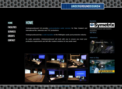 Undergroundsound is a post production sound facility in downtown Wellington, and a major change of pace for us. We produced a site that is subdued while remaining strong in terms of design, rounded off by embedded YouTube content and an elegant, Flash-driven navigation system which recalls the faders so typical of recoding equipment.